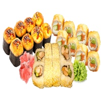 Состав: ЗАПЕЧЕННЫЙ С ОКУНЕМ, ЗАПЕЧЕННЫЙ С КРАБОМ, САЛМОН ТУНА, АСАХИ (васаби 10 гр, имбирь 30 гр, соевый соус 60гр, 2 палочки) (32 кусочка)