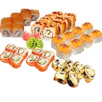 Состав: ФИЛАДЕЛЬФИЯ, ДРАКОН, СЕГУН, ЗАПЕЧЕННЫЕ С КРЕВЕТКОЙ И ОКУНЕМ (васаби 10 гр, имбирь 30 гр, соевый соус 60 гр, 2 палочки) (40 кусочков)