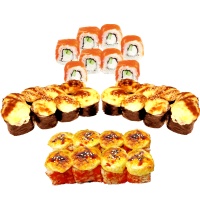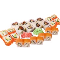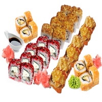 Состав: ФИЛАДЕЛЬФИЯ, АСАХИ, ЗАПЕЧЕННАЯ КАЛИФОРНИЯ, ЗАПЕЧЕННЫЙ С КРЕВЕТКАМИ (васаби 10 гр, имбирь 30 гр, соевый соус 60 гр, 2 палочки) (32 кусочка)