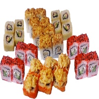 Состав: ЗАПЕЧЕННЫЙ С КУРИЦЕЙ, ЗАПЕЧЕННЫЙ С КРАБОМ, КАМУИ, КАТАНА (васаби 10 гр, имбирь 30 гр, соевый соус 60 гр, 2 палочки) (32 кусочка)