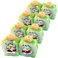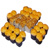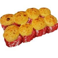 Состав: имитация снежного краба, огурец, майонез, икра тобико, сырный крем, кунжут, терияки