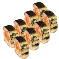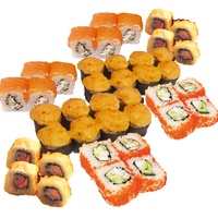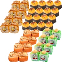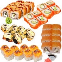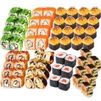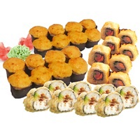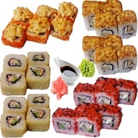 Состав: ЗАПЕЧЕННЫЙ С ОКУНЕМ, ЗАПЕЧЕННЫЙ С КРАБОМ, САЛМОН ТУНА, АСАХИ (васаби 10 гр, имбирь 30 гр, соевый соус 60гр, 2 палочки) (32 кусочка)