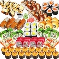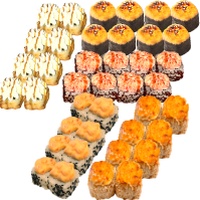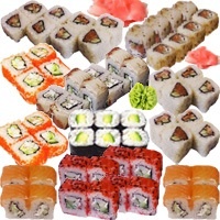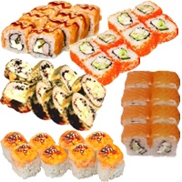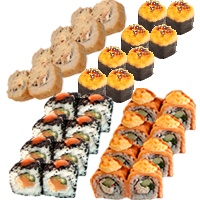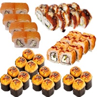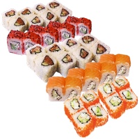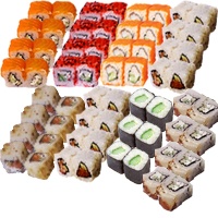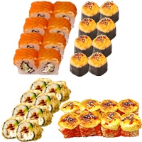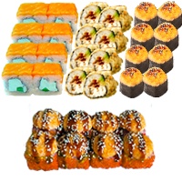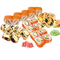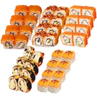 Состав: ФИЛАДЕЛЬФИЯ, КАЛИФОРНИЯ, ЯКУДЗА, НЬЮ-ЙОРК, КАНАДСКИЙ (васаби 10 гр, имбирь 30 гр, соевый соус 60 гр, 2 палочки) (40 кусочков)