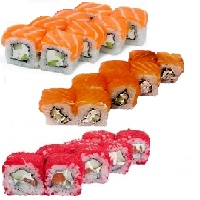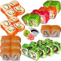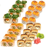 Состав: ФИЛАДЕЛЬФИЯ, КАЛИФОРНИЯ, ГАВАЙСКИЙ, СЕНСЕЙ, (васаби 10 гр, имбирь 30 гр, соевый соус 60 гр, 2 палочки) (32 кусочка)