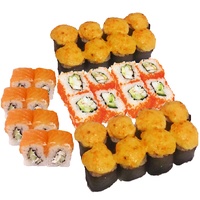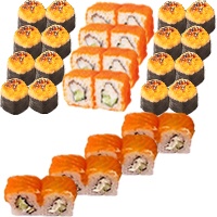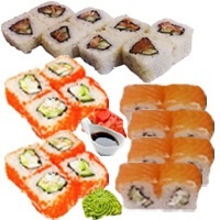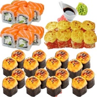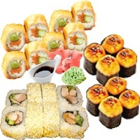 Состав: ФИЛАДЕЛЬФИЯ, АСАХИ, ЗАПЕЧЕННАЯ КАЛИФОРНИЯ, ЗАПЕЧЕННЫЙ С КРЕВЕТКАМИ (васаби 10 гр, имбирь 30 гр, соевый соус 60 гр, 2 палочки) (32 кусочка)