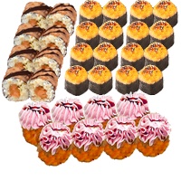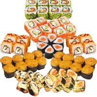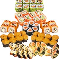 Состав: ФИЛАДЕЛЬФИЯ, ДРАКОН, СЕГУН, ЗАПЕЧЕННЫЕ С КРЕВЕТКОЙ И ОКУНЕМ (васаби 10 гр, имбирь 30 гр, соевый соус 60 гр, 2 палочки) (40 кусочков)