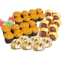 Состав: ЗАПЕЧЕННЫЙ С КУРИЦЕЙ, ЗАПЕЧЕННЫЙ С КРАБОМ, КАМУИ, КАТАНА (васаби 10 гр, имбирь 30 гр, соевый соус 60 гр, 2 палочки) (32 кусочка)
