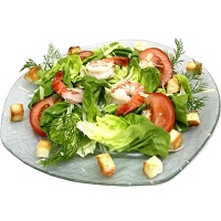 Состав: салат айсберг, тигровые креветки 3 шт., помидоры черри , сухарики, сыр пармезан, заправка
