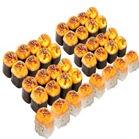 Состав: ТРИ ПОРЦИИ ЗАПЕЧЕННЫХ РОЛЛОВ: С ЛОСОСЕМ, С ОКУНЕМ, С КРЕВЕТКОЙ, ГРИЛЬ УНАГИ МАКИ (васаби 10гр, имбирь 30 гр, соевый соус 60 гр, 2 палочки) (32 кусочка)