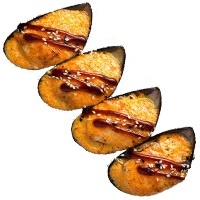 Состав: креветки, сыр креметте, огурец, тобико, кляр, панировочные сухари, терияки, кунжут