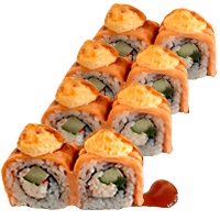 Состав: креветка, огурец, спайси-соус, лосось, кунжут, терияки, сыр креметте