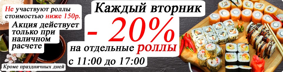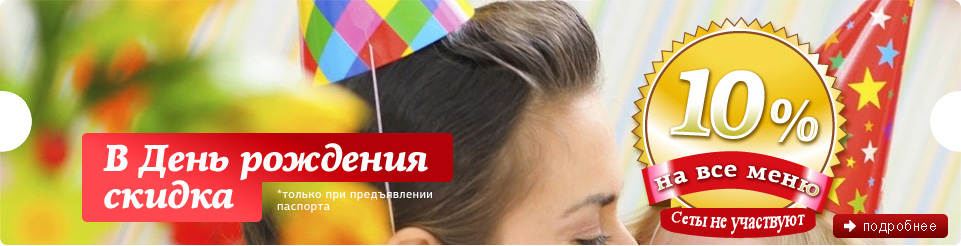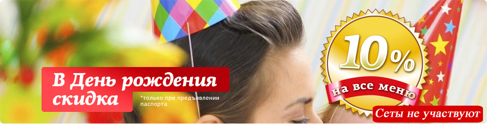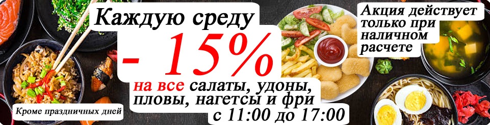 С понедельника по четверг СКИДКА 10% НА ВСЕ МЕНЮ (кроме сетов) с 12:30 до 16:00!