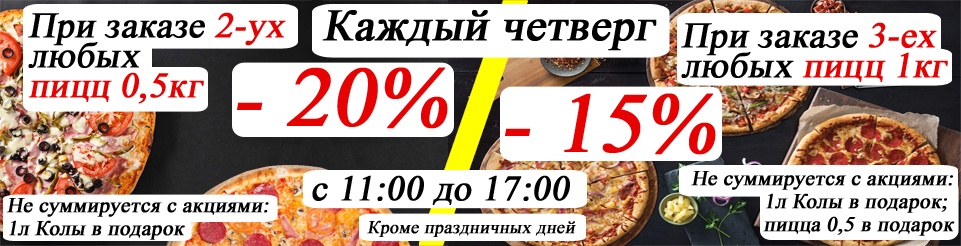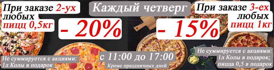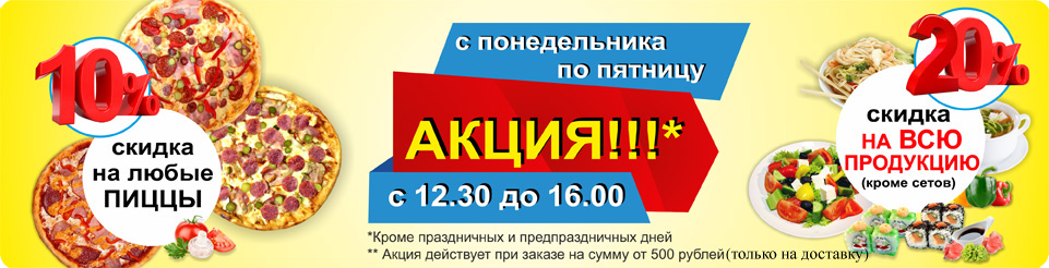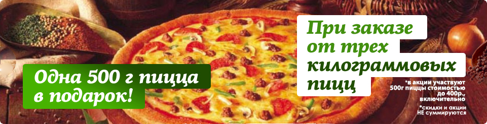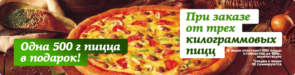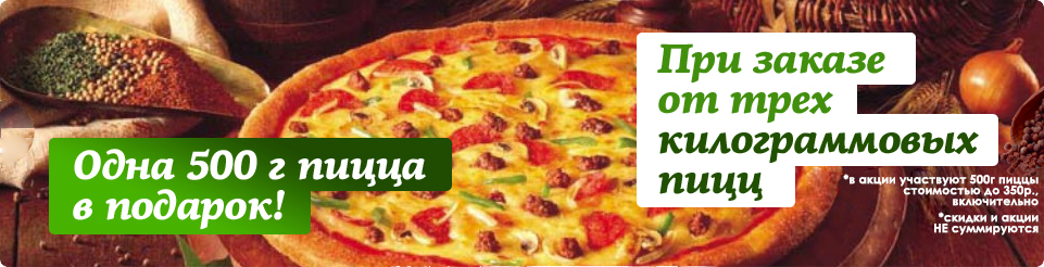 В акции участвуют 500г пиццы стоимостью до 550р., включительно. *Скидки и акции НЕ суммируются.
