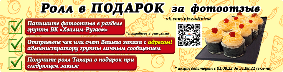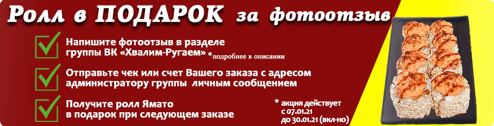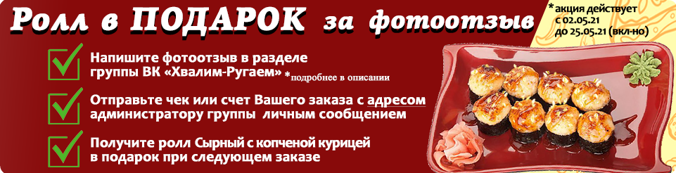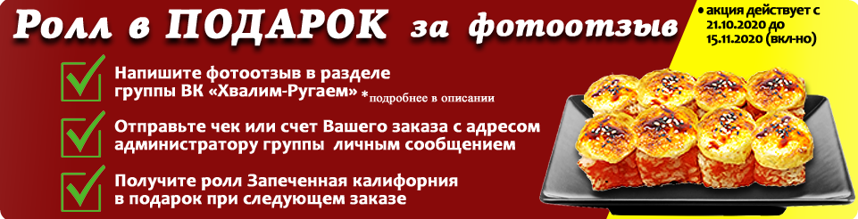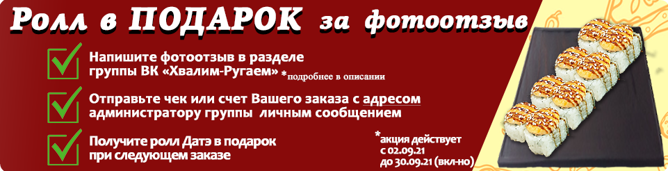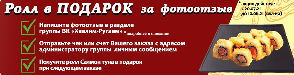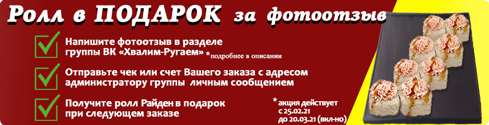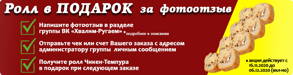 - Возможность получения ролла при след. заказе доступна только в период действия акции